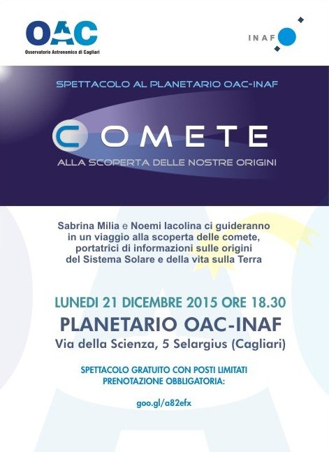 Il 21 dicembre 2015 all'Osservatorio Astronomico di Cagliari sarà possibile assistere, gratuitamente e solo su prenotazione online, al nuovo spettacolo del Planetario curato da Sabrina Milia e Noemi Iacolina. Le due ricercatrici ci guideranno in un viaggio alla scoperta delle comete, portatrici di informazioni sulle origini del Sistema Solare e della vita sulla Terra