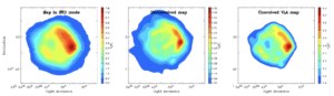 Mappe radio del resto di supernova Cassiopea A ottenute con il radiotelescopio INAF Sardinia Radio Telescope ad una frequenza di 20 GHz. Il pannello a sinistra mostra l’immagine ottenuta utilizzando la modalità di osservazione standard, mentre il pannello centrale rappresenta l’immagine elaborata ottenuta con la nuova modalità di osservazione a super-risoluzione. Per confronto, il pannello a destra mostra un’immagine d’archivio ottenuta con un interferometro radio (Very Large Array), a una risoluzione angolare paragonabile a quella della modalità a super-risoluzione di SRT. Sia la mappa dell’interferometro sia la nuova mappa di SRT mostrano dettagli della sorgente non visibili nell’immagine standard di SRT. Crediti: L. Olmi/INAF